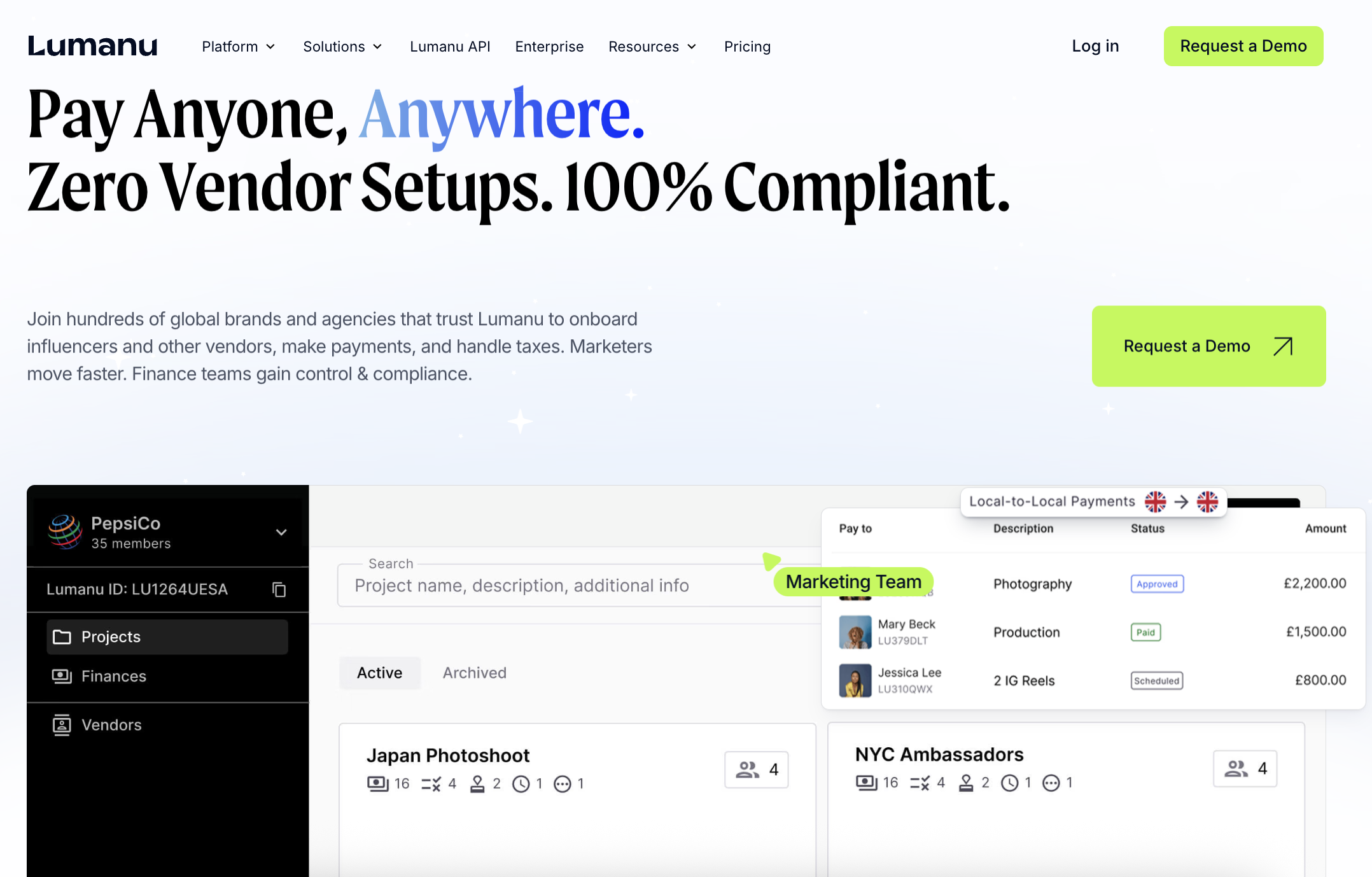 Lumanu is built for brands and agencies that need to pay large numbers of influencers, creators, and marketing vendors while staying compliant in multiple countries. It acts as a “payments master vendor” inside your finance stack, handling creator onboarding, global payouts, and back-office compliance so marketing teams can move faster without creating hundreds of new vendor records. Lumanu automates tax form collection and validation, runs ongoing OFAC/AML/KYC screening, and generates year-end forms like 1099s and 1042-S for creators in 180+ countries.
