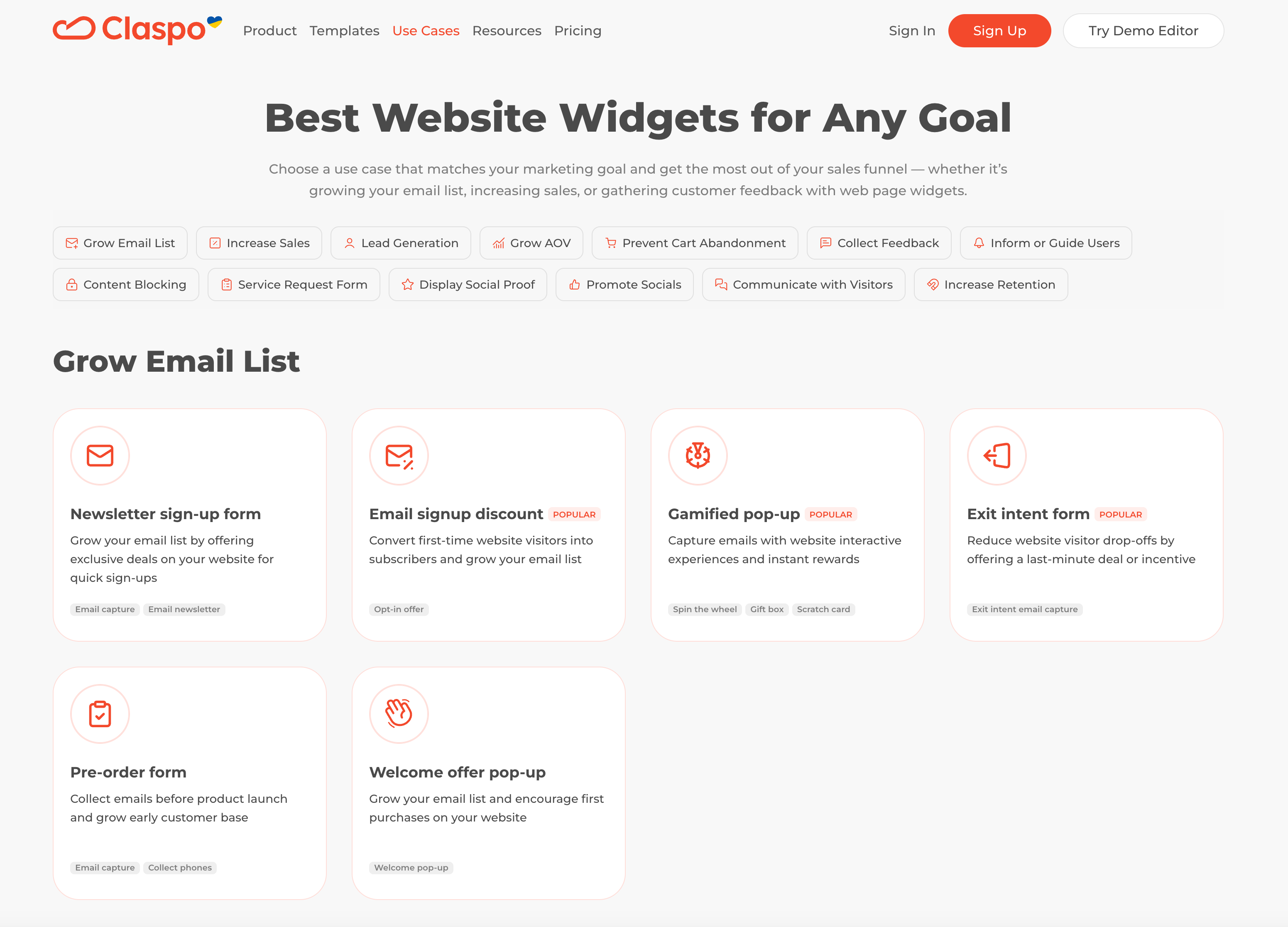 Claspo is a no-code on-site conversion platform that offers free website widgets for capturing leads and growing email lists directly on your website. Instead of replacing email marketing platforms, Claspo focuses on the very first step of the funnel – turning visitors into subscribers using popups, embedded forms, and interactive on-site messages.