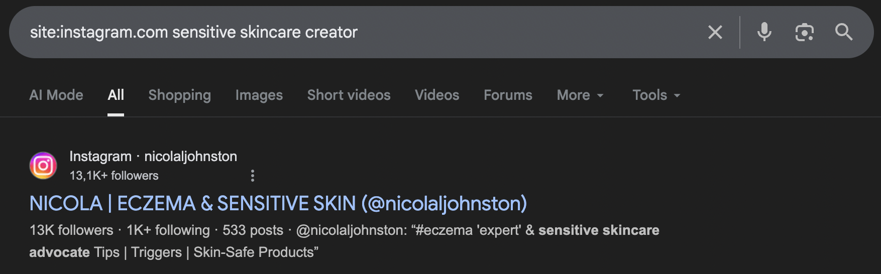 Google is a useful simple tool when platform search does not return enough relevant results. It helps find creators who rank well outside social feeds, such as bloggers, YouTubers, or Instagram creators with strong profiles but lower visibility in hashtag searches.