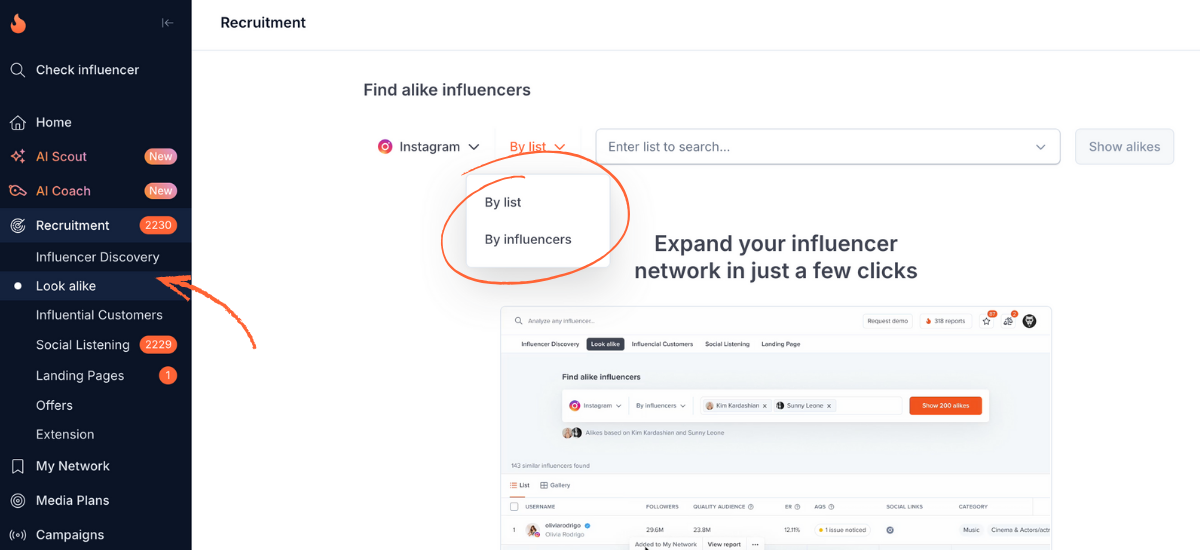 Lookalike tools are built into some influencer marketing platforms, such as HypeAuditor. This feature lets you discover creators similar to those you already like. In HypeAuditor, there are two ways to run a lookalike search.