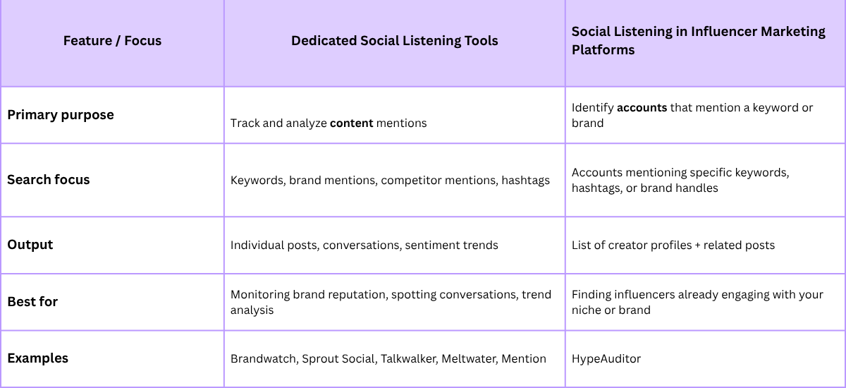 Comparison table: Dedicated Social Listening Tools vs. Social Listening Inside IM Platforms