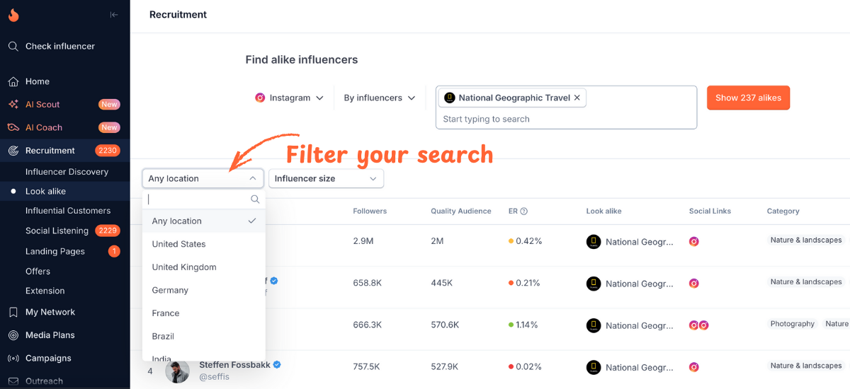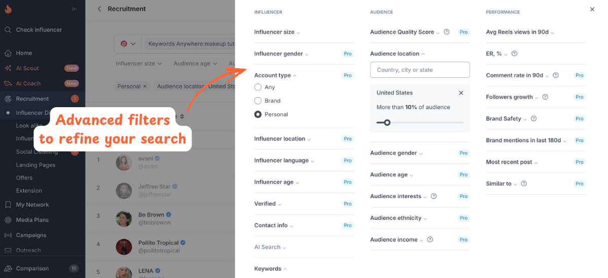 To make this search more efficient, you can use our Influencer Discovery tool, which includes 27 advanced filters. They allow you to refine results based on both creator attributes (follower range, platform, country, and account type) and audience characteristics (demographics, geolocation, and interests), as well as performance metrics such as engagement and follower growth.