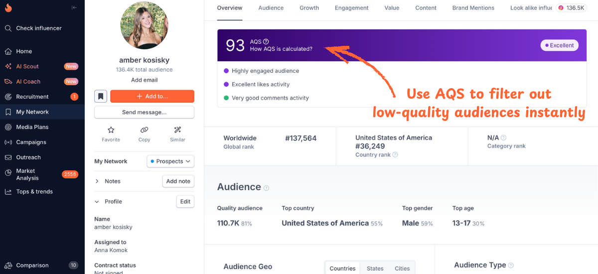 HypeAuditor also allows you to pre-filter creators by brand safety indicators and authenticity, using the Audience Quality Score (AQS). This way, you only see genuine and trustworthy creators before you even start reviewing profiles.