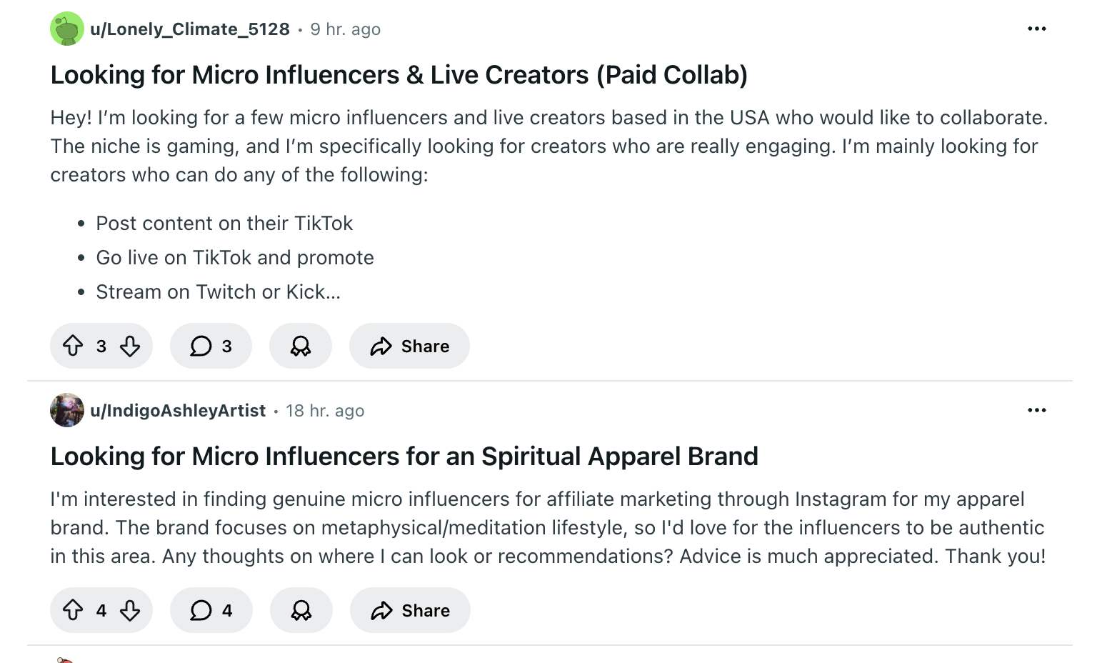 Platforms like Reddit (e.g., r/UGCCreators, r/InfluencerMarketing) or Discord groups host many micro-influencers open to collaborations. You can post a request describing your brand and the type of creators you’re looking for.