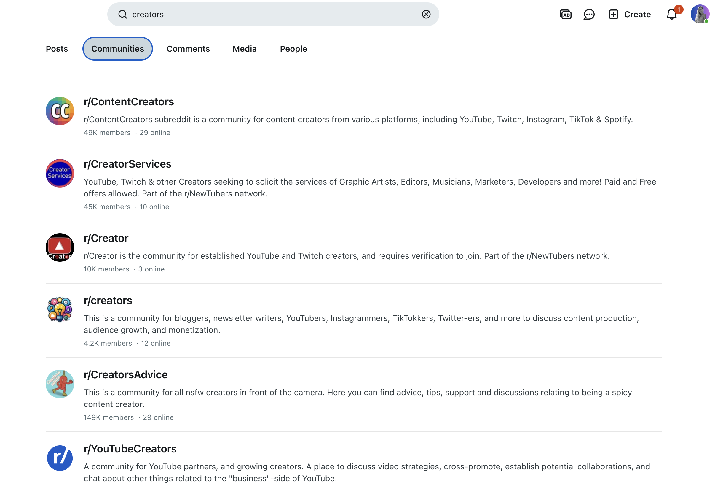 On Reddit, searching is fairly straightforward. Just type “creators” or “influencers” into the search bar and browse through the communities that appear. There’s no need to overthink keywords, broad terms work best. Look at the community name and description to understand whether it matches your niche.