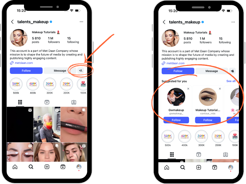To use this feature, first identify an influencer who feels like a true match for your campaign. Open their profile and tap the person icon (the “similar accounts” button). You’ll see a row of Suggested for you accounts, you can scroll horizontally to view a few options.