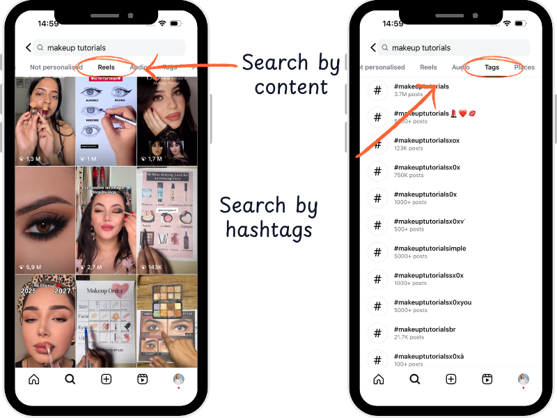 When it comes to hashtag research, I recommend not typing hashtags in the search bar. Instead, enter a keyword, then switch to the Tags tab. Instagram will show you all related hashtags, starting with the most relevant (exact matches) and then variations. This approach helps you avoid missing important spellings or variations.