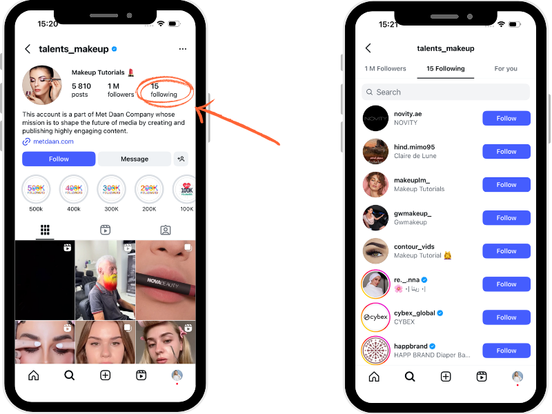 To use this method, open the creator’s Instagram profile and tap the “Following” count. You’ll see a full list of accounts they follow.