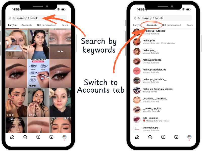 If you type a keyword or phrase directly into the Instagram search bar, you’ll first see a selection of posts and Reels related to your query. By switching tabs, you can move to the Accounts section, where you’ll often find profiles dedicated to that niche, usually your keyword appears either in the account name or in the bio.