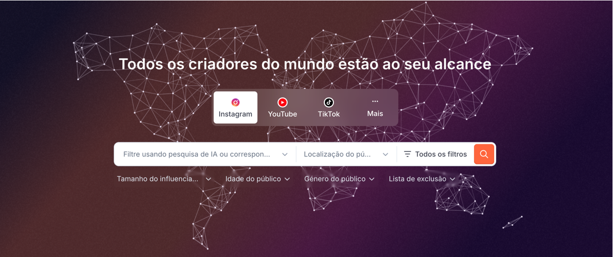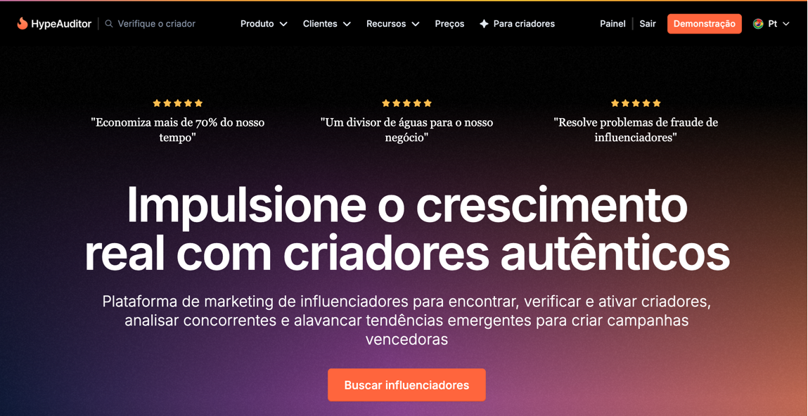 Principais recursos: Busca de influenciadores, outreach em massa, gestão de campanhas, análise de performance, detecção de fraude, análise de concorrentes