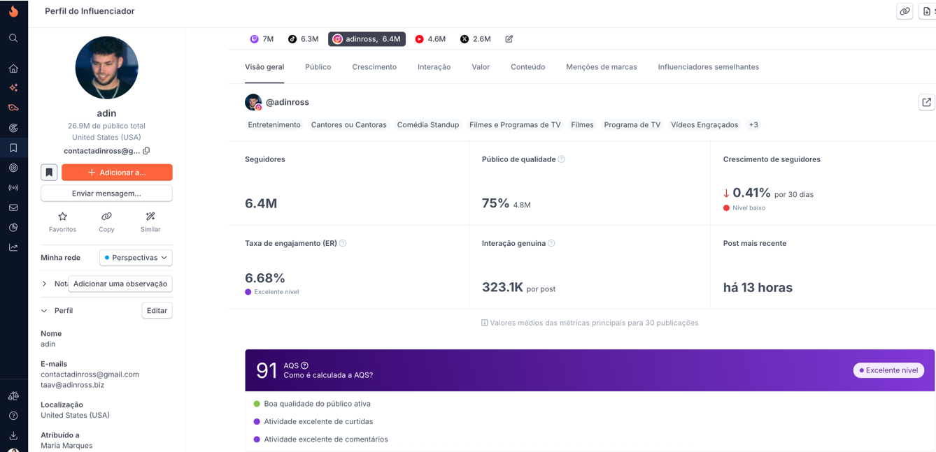 Os perfis incluem biografia, histórico de colaborações, análises do público e até 2,5 anos de conteúdo, permitindo uma visão clara da evolução do influenciador ao longo do tempo. Com informações demográficas e psicográficas, as marcas podem entender profundamente quem compõe o público e qual é o real impacto daquele criador.