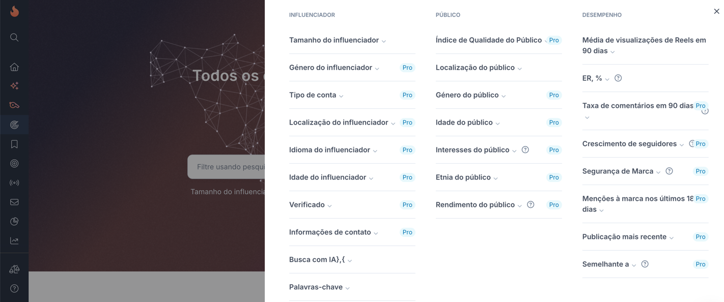Essa ferramenta conta com os algoritmos de IA, que permitem fazer pesquisas avançadas e ajudam os profissionais de marketing a encontrar influenciadores com base em sua descrição, por exemplo "criadora de fitness, mulher de Rio de Janiero com alto engajamento", e a IA irá escanear milhões de perfis para fornecer resultados precisos. A plataforma também oferece filtros detalhados, para que você possa segmentar melhor por tipo do público, nicho ou desempenho anterior.