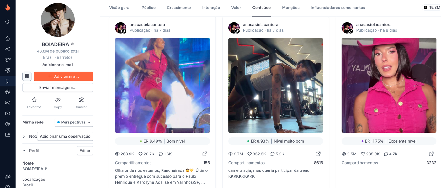 Seguidores: Ana Castela conta com aproximadamente 15,8 milhões de seguidores no TikTok. Nos últimos 30 dias, o perfil apresentou crescimento de 1,28%, adicionando cerca de 200 mil novos seguidores, um desempenho classificado como excelente para perfis de médio a grande porte, indicando forte tração orgânica e consolidação da presença na plataforma.