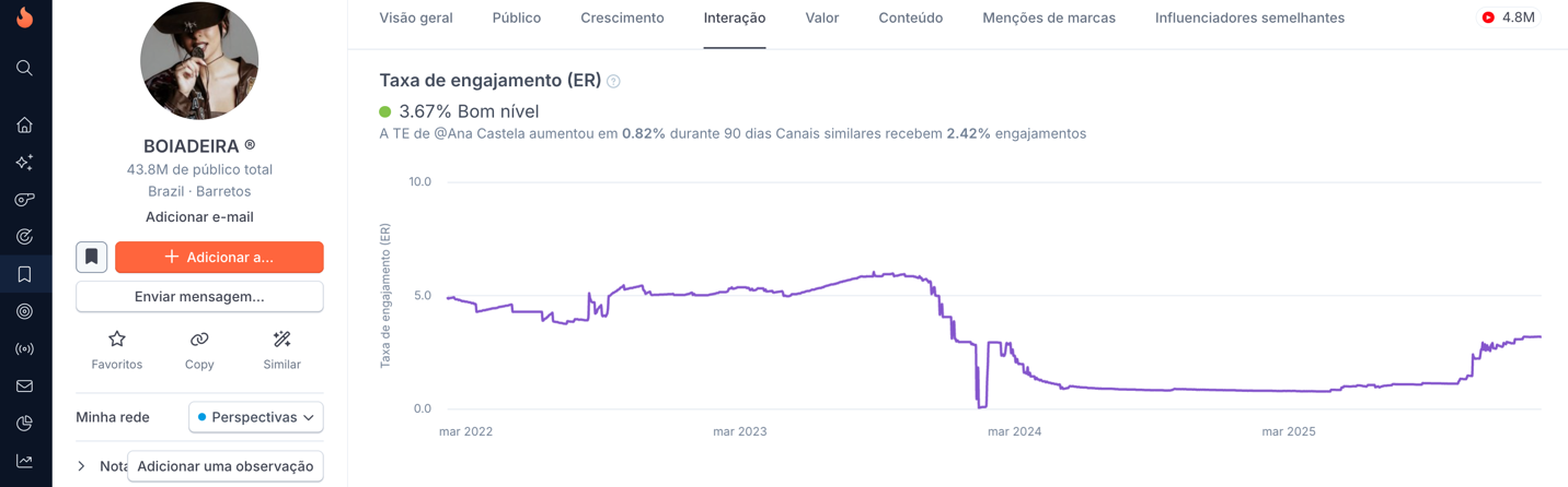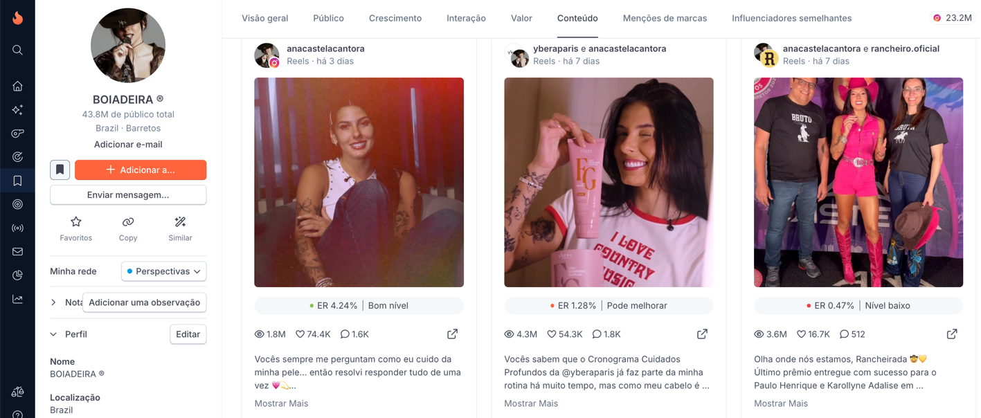 Ana Castela combina crescimento acelerado, engajamento sólido e alta frequência de publicações, o que torna seu perfil altamente relevante para marcas que buscam alcance, interação e influência junto a um público jovem-adulto, digitalmente ativo e conectado à cultura pop e sertaneja.