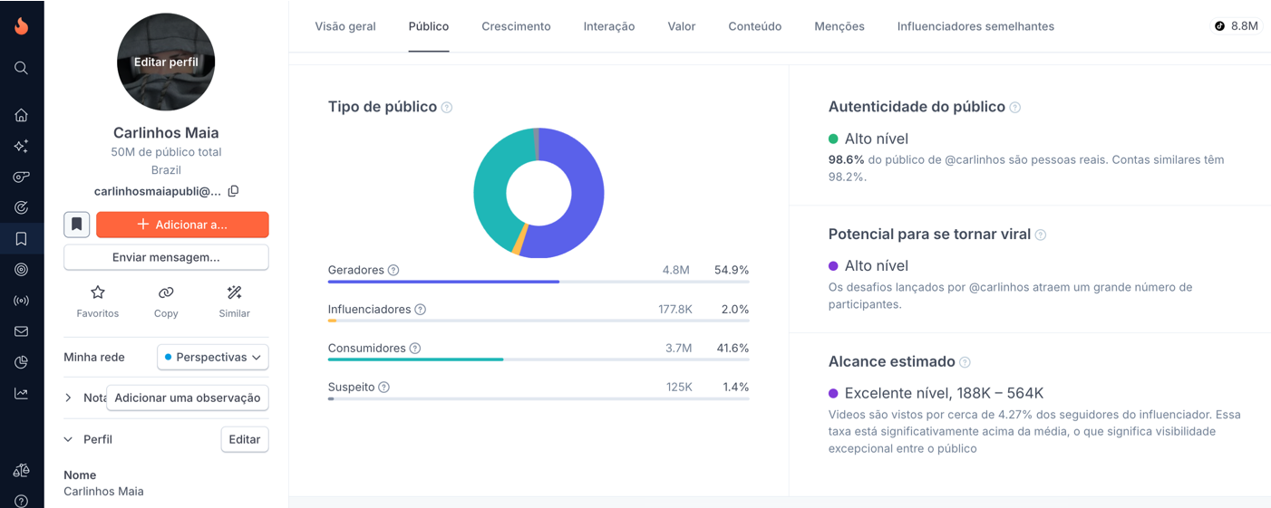 Carlinhos Maia combina alcance massivo, engajamento acima da média e forte conexão emocional com um público majoritariamente feminino e adulto jovem. Seu storytelling pessoal e a exposição constante da vida privada sustentam a recorrência de interações e mantêm a audiência ativa.