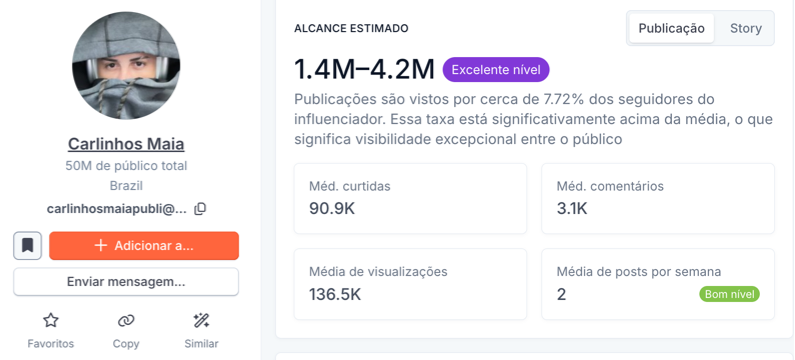 | Alcance médio por post | 1,4M – 4,2M | Excelente |