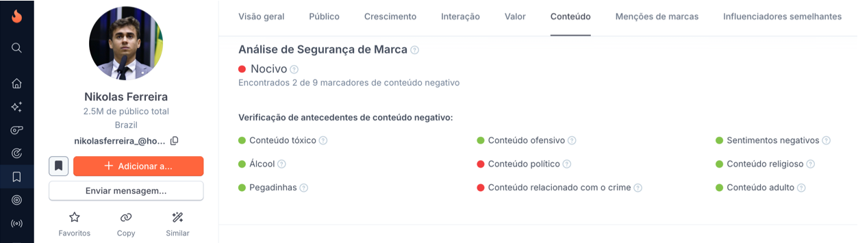 Em termos de qualidade, o canal possui CQS 73, considerado bom nível, com boa credibilidade e interação consistente. No entanto, o conteúdo é predominantemente político e opinativo, com abordagem voltada a temas públicos, ideológicos e de conjuntura nacional. A análise de segurança de marca aponta presença de marcadores ligados a conteúdo político e religioso, além de linguagem associada a debates polarizados.