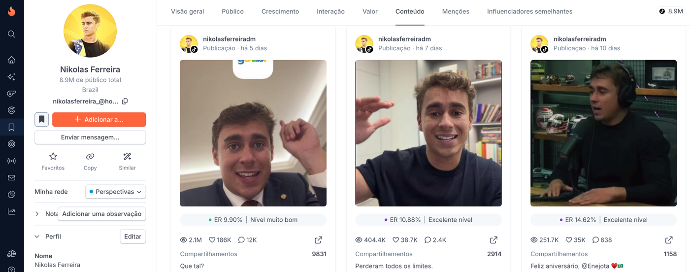 Seguidores: Nikolas Ferreira conta com aproximadamente 8,9 milhões de seguidores no TikTok. Nos últimos 30 dias, o perfil cresceu 4,71%, adicionando cerca de 400 mil novos seguidores — um desempenho classificado como excelente. O crescimento recente reforça a forte tração orgânica do perfil e a consolidação da presença na plataforma.