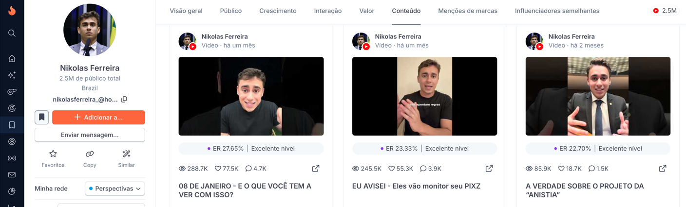 De forma geral, o Instagram de Nikolas funciona como um canal de comunicação direta, com alto alcance orgânico, forte capacidade de mobilização e grande volume de interação — características que explicam seu destaque digital dentro da categoria política no Brasil.