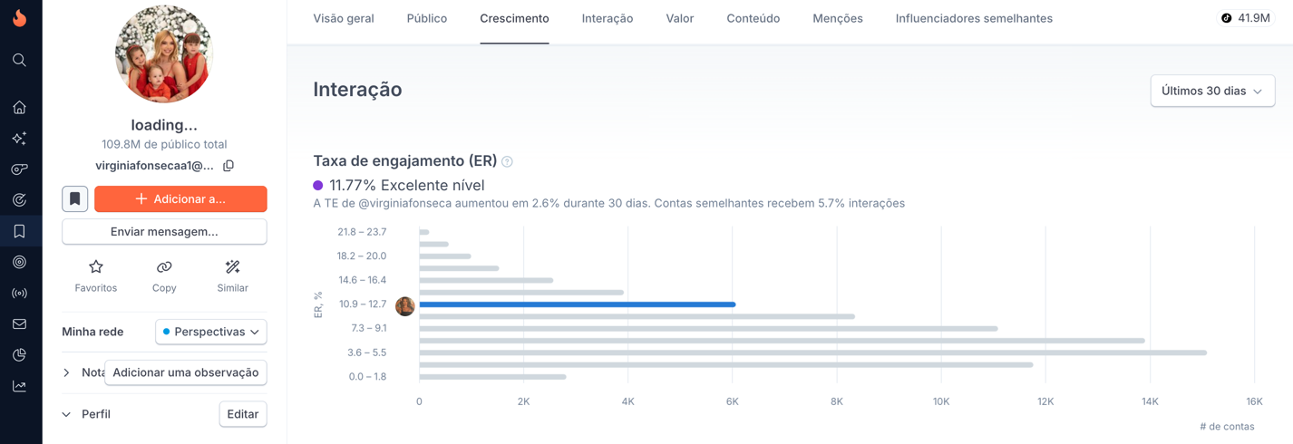 Seguidores: Virginia Fonseca conta com aproximadamente 41,9 milhões de seguidores no TikTok. Nos últimos 30 dias, o perfil apresentou um crescimento de 0,72%, com a adição de cerca de 300 mil novos seguidores, um desempenho classificado como excelente para perfis de grande escala e que indica forte tração contínua na plataforma.