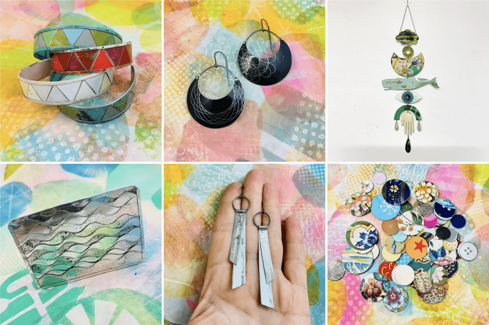 Christine Terrel's bio clearly explains what she does. She makes jewelry using recycled materials, primarily tin.