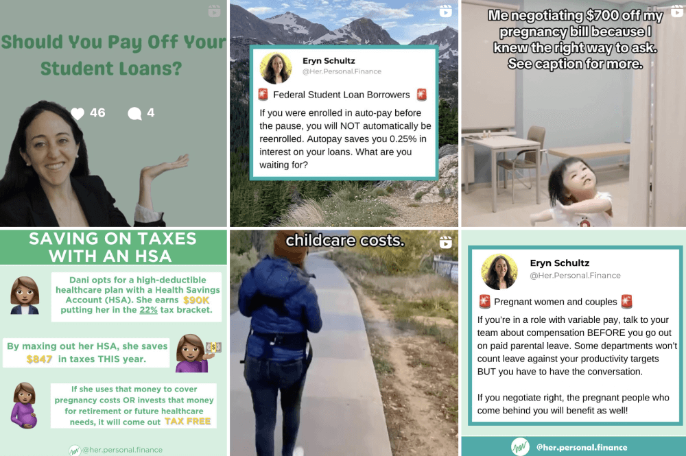 This is a great example of listening to your followers or simply understanding their needs and creating content that provides solutions. Eryn Schultz's Instagram feed is filled with financial advice for students, mothers, and young couples with babies.Partner with other influencers