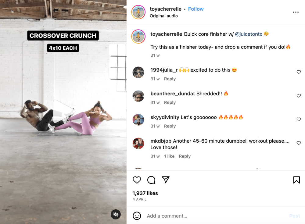 Toya Cherrelle White, a fitness instructor based in LA, regularly shares nutrition and workout tips with her husband Julius, who is likewise a fitness influencer.Collaborate with brands