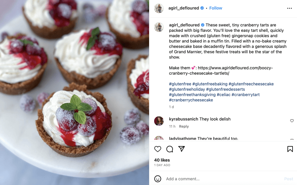 Take a look at the photo post and brief recipe description of agirl_defloured with relevant hashtags. People with celiac disease or gluten intolerance will specifically search for gluten-free recipes on Instagram and will easily discover recipes that use the right keywords and phrases.
