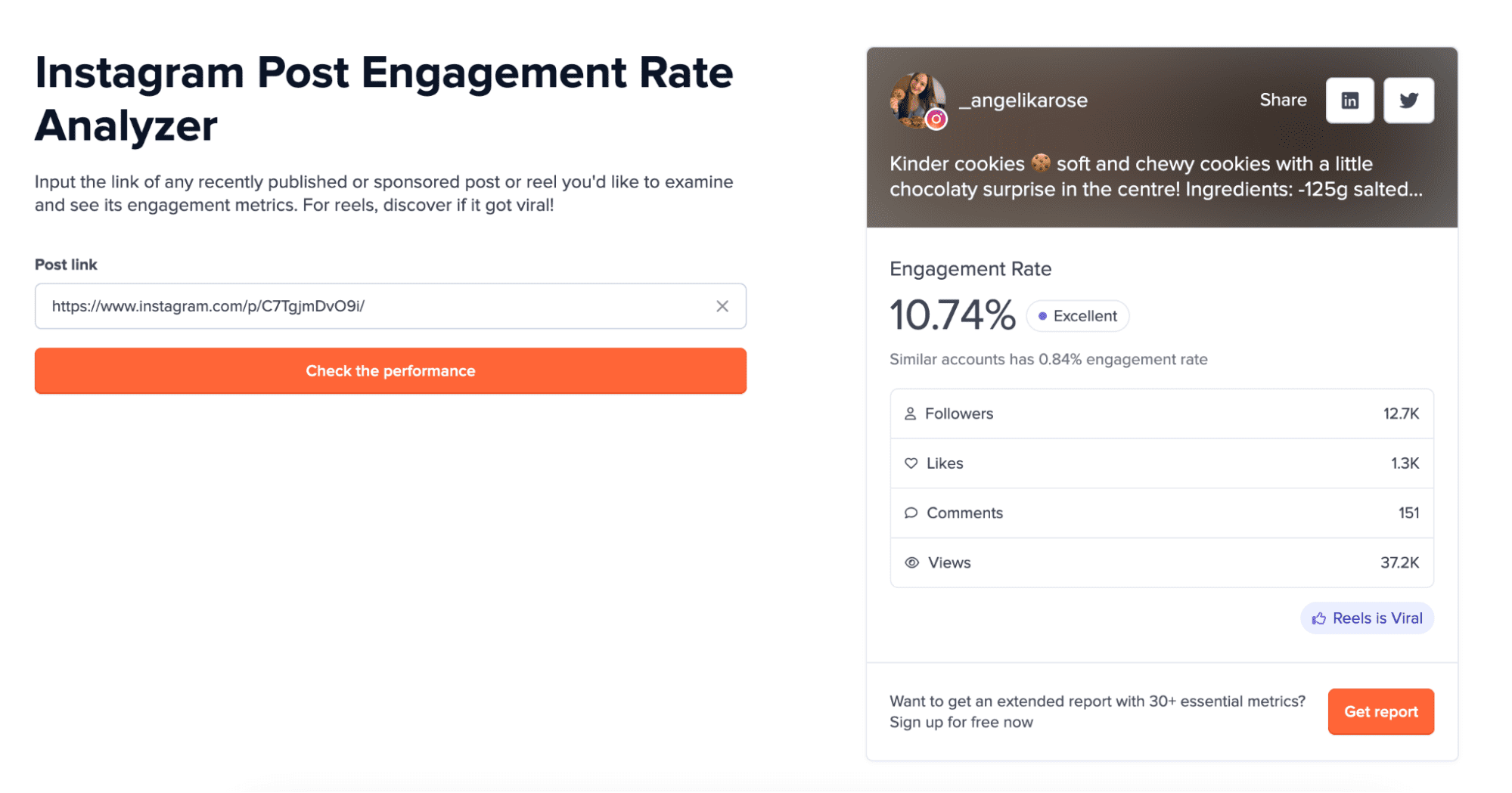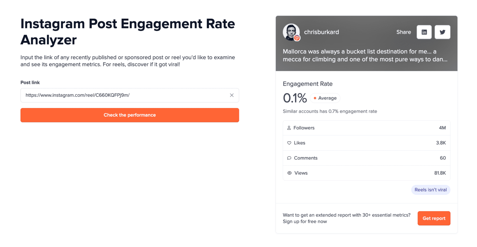 Additionally, the tool informs you whether your ER is ‘average’, ‘good’, ‘very good’, or ‘excellent’ and shows you whether the particular reel has become viral.